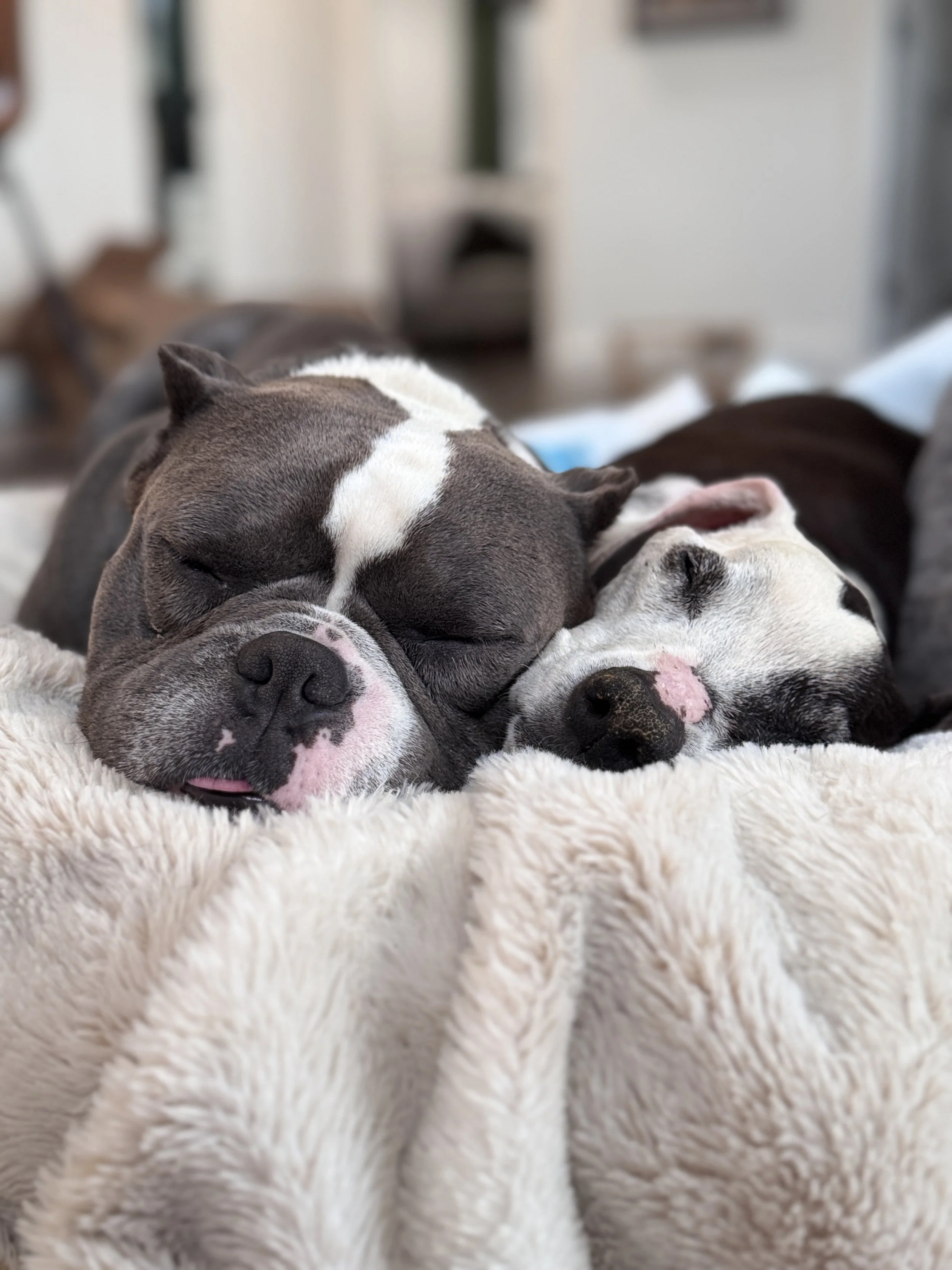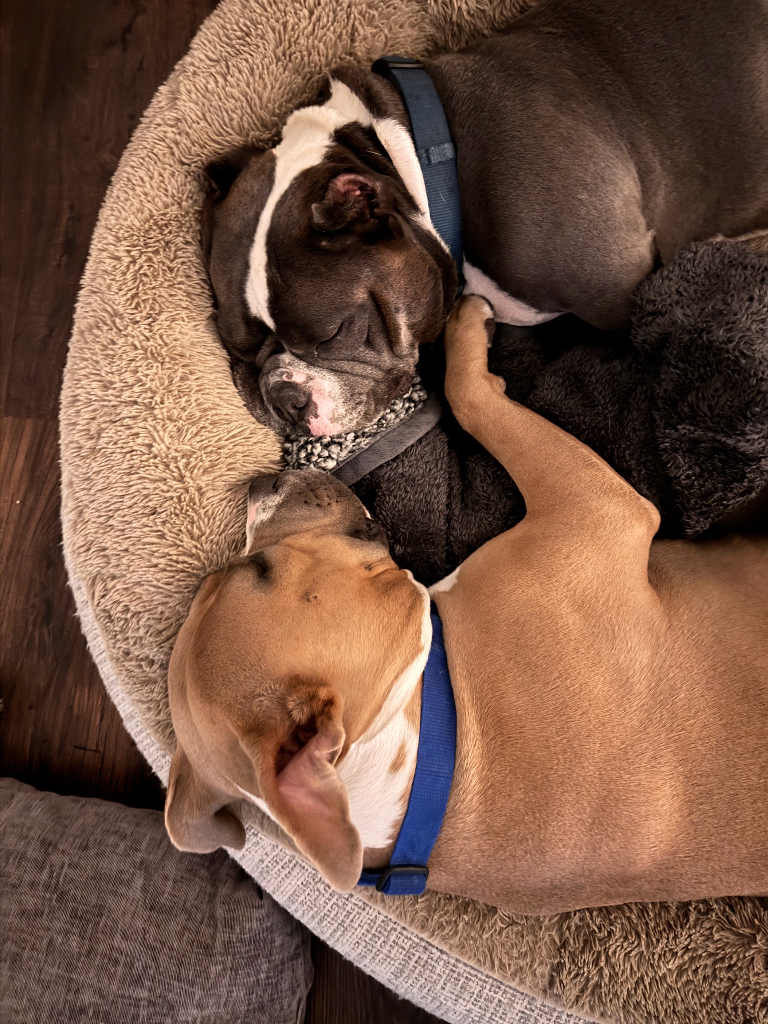 Bluey and Birdie came to us for temporary stays—both rescues from Passion for Pitties—but it didn’t take long for them to become part of our forever family. Bluey instantly bonded with Maddie in her final months, forming a connection we hadn’t seen with any other guest. Later, Birdie arrived needing a calm place to heal after giving birth. Within days, she settled beside Bluey as if she’d always been here, and her timing felt divine. Birdie and Bluey complete our family.